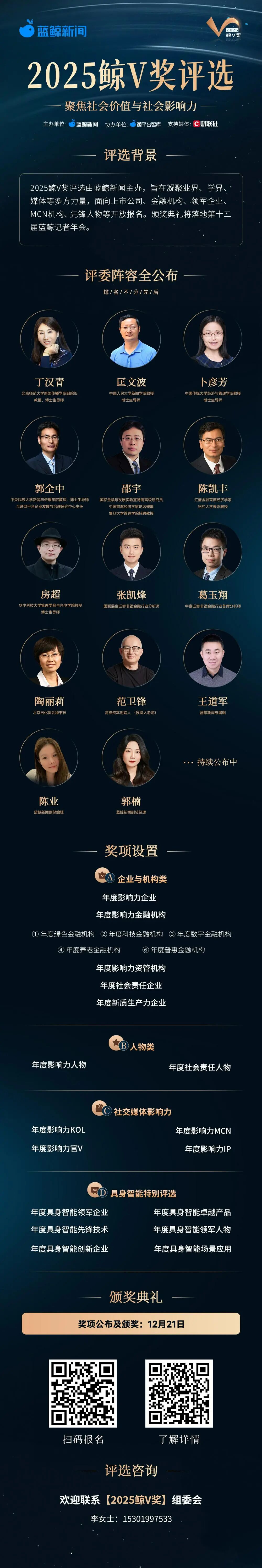 今年9月评选开启报名以来,经过自主申报和评委推荐,我们收到数百家上市公司、金融机构、创新企业、MCN机构等参评信息。针对不同维度奖项评选,2025鲸V奖评选邀请产学研各方组成专家评审团,现正式对外公布评委团阵容: