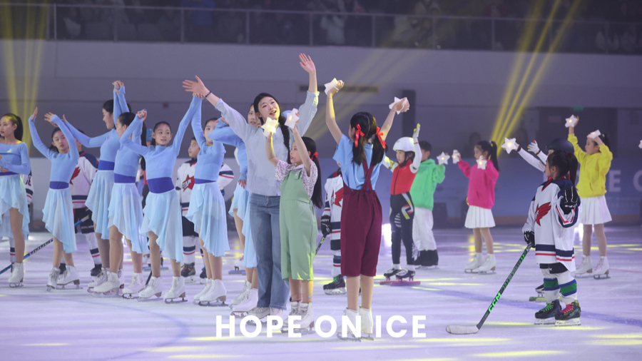 演出阵容星光熠熠,汇聚了体育界与艺术界的顶尖力量:中国首位花样滑冰世界冠军陈露、花样滑冰双人滑世界冠军庞清与佟健、两届世青赛冠军暨亚冬会金牌得主于小雨、多次斩获全国冠军花滑小将安香怡,以及全国花滑冠军赛双人滑亚军组合李宣潼与李泽恩,用灵动冰舞诠释生命力量;新加坡交响乐团单簧管首席、著名单簧管演奏家马越,国家一级演员、著名女高音歌唱家黄英,中国音乐家协会理事、中国内地青年歌唱家平安,中国内地青年女演员、歌手马吟吟跨界加盟,以悠扬乐声、深情演唱传递真挚情感。8名来自上海舞蹈学院的芭蕾舞演员,将足尖艺术的优雅与冰面的灵动碰撞融合,带来耳目一新的跨界表达;近百名青少年儿童冰上运动员则以童真视角发力,用纯粹的童声合唱、清澈的诗朗诵与灵动的冰上姿态,为演出注入质朴力量。各界表演者以艺术为纽带默契联动,冰舞与芭蕾相映、乐声与童声交织,共同演绎了一场兼具视觉震撼与情感温度的公益盛宴,生动诠释了援助、友爱与共创未来的美好愿景。