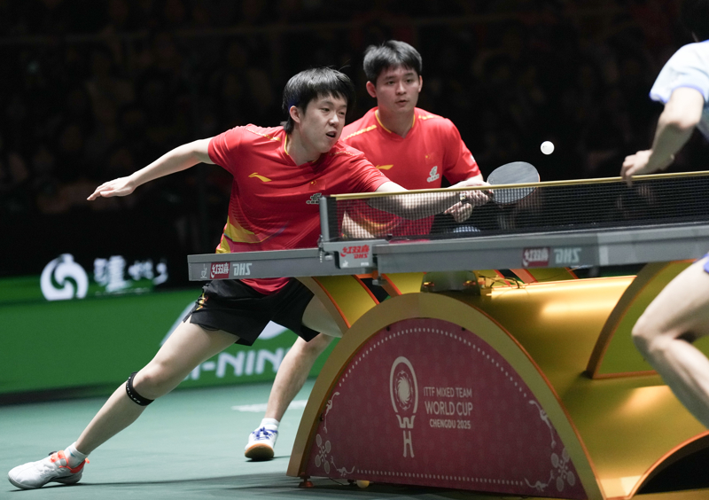 新华社照片,成都,2025年12月6日\n 12月6日,中国队组合林诗栋/王楚钦(左)在比赛中。最终,他们在男双比赛中1比2不敌日本队组合篠塚大登/户上隼辅。\n 当日,在四川成都举行的2025年国际乒联混合团体世界杯第二阶段比赛中,中国队总比分8比5战胜日本队。\n 新华社记者 王迎 摄