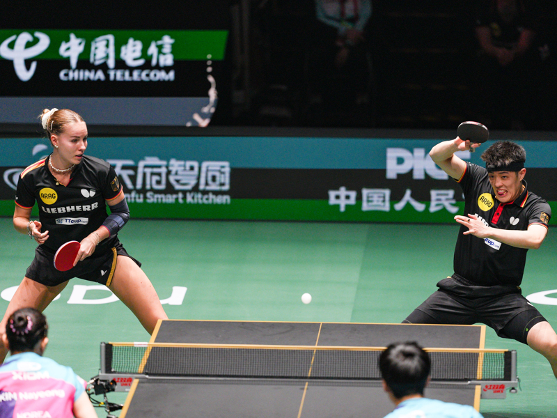新华社照片,成都,2025年12月7日\n 12月7日,德国队组合安妮特·考夫蔓/邱党(右)在混双比赛中。他们2比1战胜韩国队组合金娜英/朴康贤。\n 当日,在四川成都举行的2025年国际乒联混合团体世界杯铜牌赛中,德国队总比分8比7战胜韩国队,获得铜牌。\n 新华社记者 王曦 摄