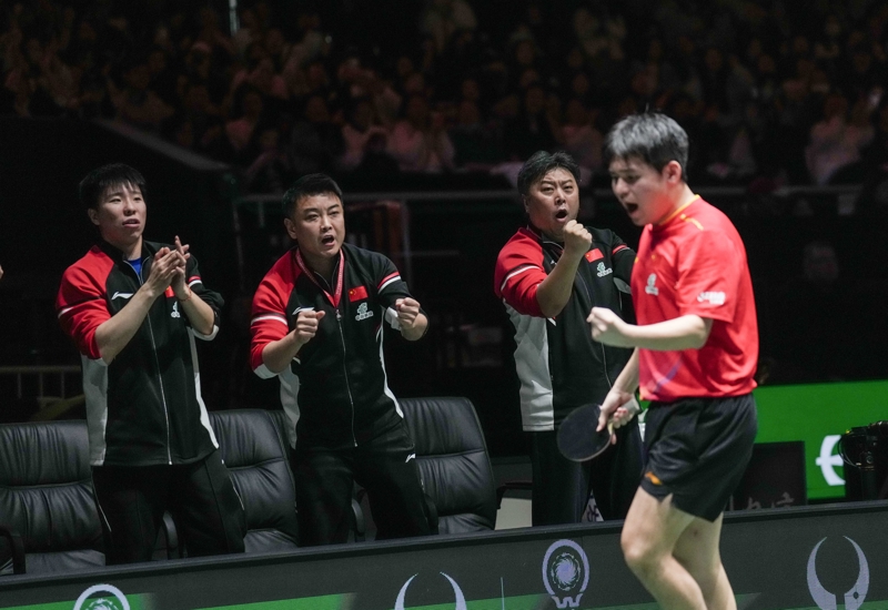 新华社照片,成都,2025年12月7日\n 12月7日,教练王皓(左二)和团队为中国选手林诗栋(右一)加油。林诗栋2比1战胜日本队选手张本智和。\n 当日,在四川成都举行的2025年国际乒联混合团体世界杯决赛中,中国队总比分8比1战胜日本队,蝉联冠军。\n 新华社记者 王迎 摄